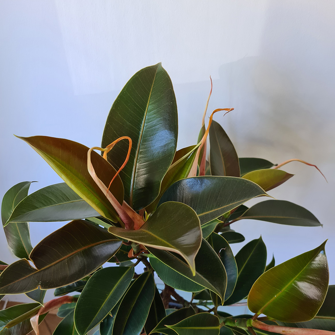 Ficus elastica 'Melany' sobna je biljka intenzivno zelenih mesnatih listova s crvenkastim odsjajem.